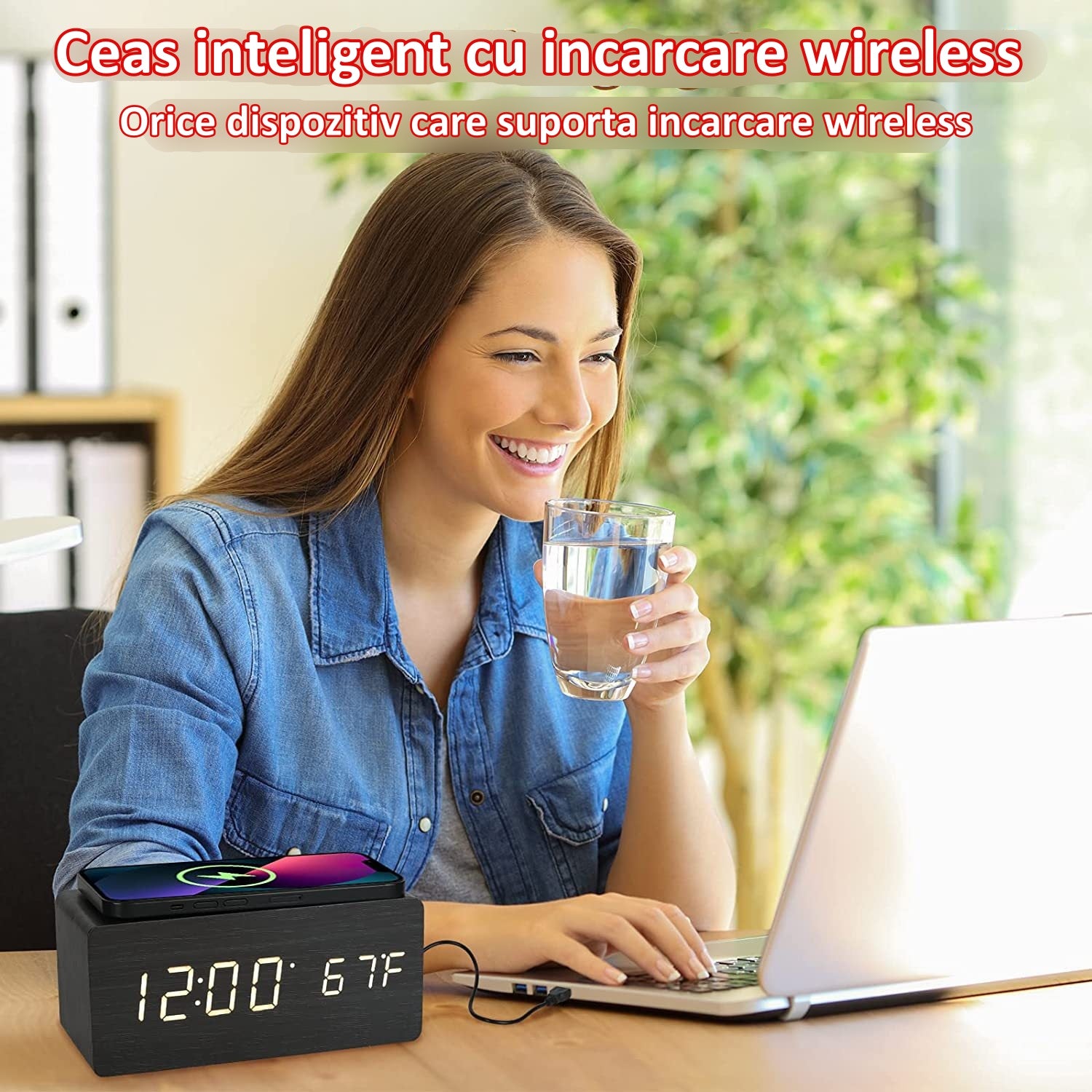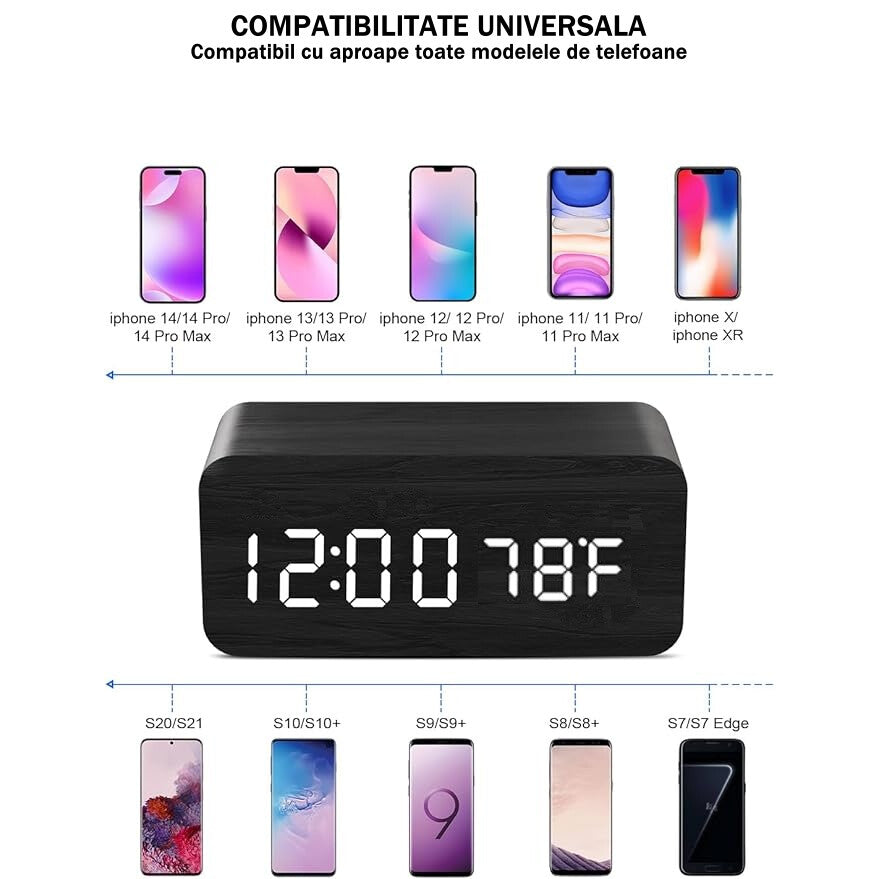 Digitális asztali óra vezeték nélküli töltéssel, fehér LED, hőmérséklet, riasztó, hangvezérlés, 3 fényszint, 17x8x7 cm, fekete