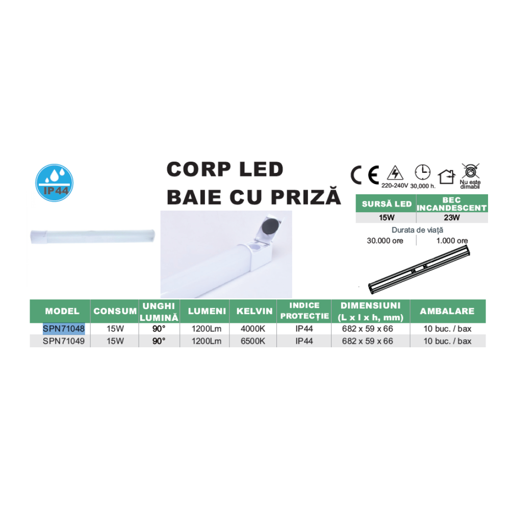 Fehér fürdőszoba LED ház, aljzattal, 15w, 6500K, hideg fény, IP44 védelemmel