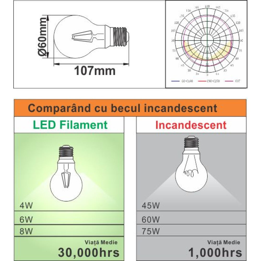 • 10x Bec Filament E27, Model A70, 14W, 4000K, Lumina Neutră.