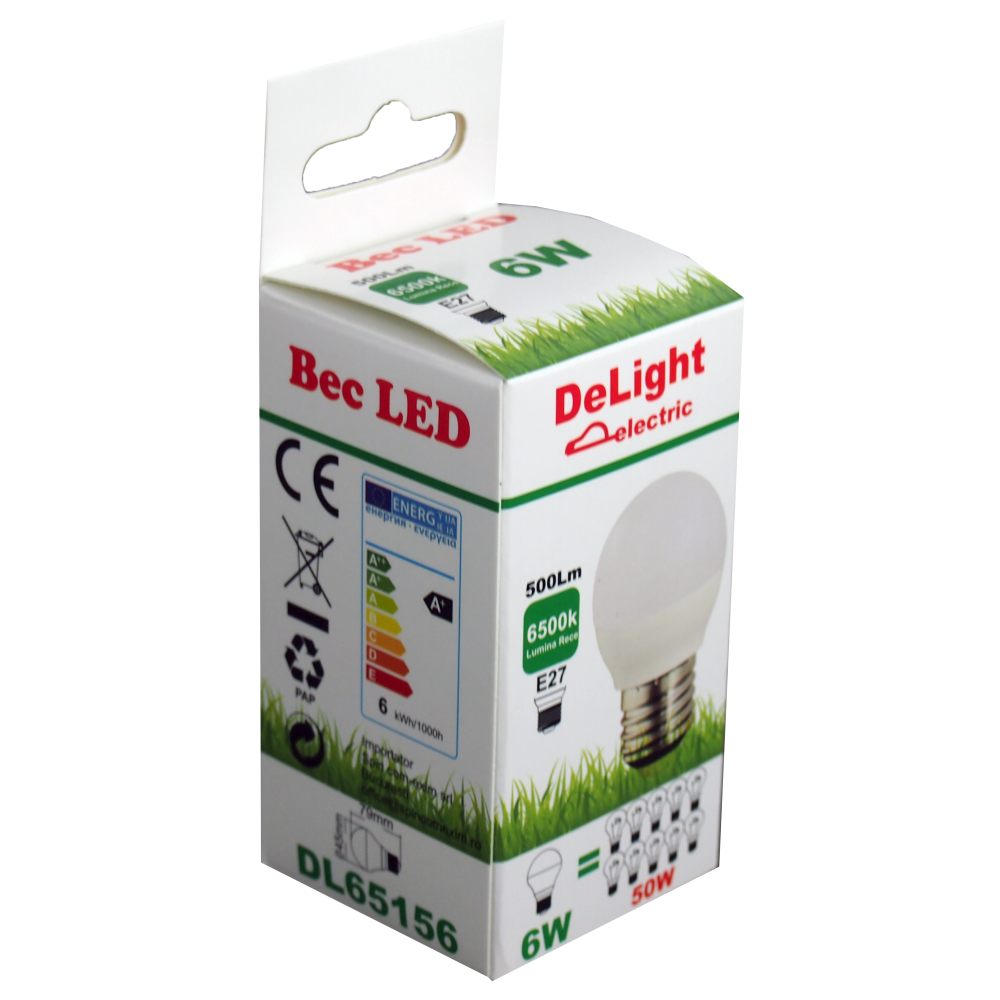 Bec LED Sferic E27 G45 6W (50W Echivalent) cu Lumina Rece 6500K – Iluminare Eficientă pentru Acasă sau Birou