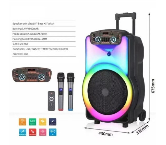 Boxa portabilă Audio Kolav 1502 este soluția ideală pentru iubitorii de muzică, oferind un sunet clar și puternic de 300W în orice mediu. Cu funcții avansate precum conectivitate Bluetooth, slot pentru card SD și port USB, această boxă este perfectă pentru petreceri, întâlniri sau pur și simplu pentru a vă bucura de muzica preferată oriunde. Designul său compact și robust face ca transportul să fie simplu, iar jocurile de lumini adaugă un plus de atmosferă.