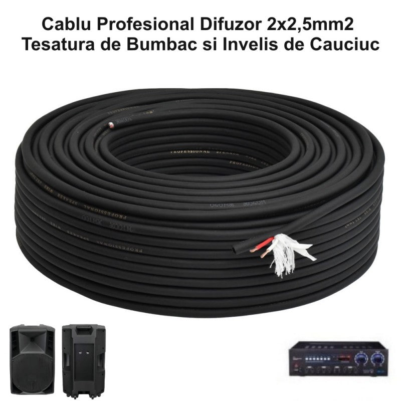 Cablul Audio Profesional Rotund 2x2,5mm² este alegerea ideală pentru cei care caută **performanță audio de înaltă calitate**. Cu o lungime de 100m, acest cablu asigură o transmitere eficientă a semnalului, fără distorsiuni. Fabricat din **cupru premium** și îmbrăcat în **țesătură de bumbac**, oferă durabilitate și flexibilitate, fiind perfect pentru diverse aplicații audio.