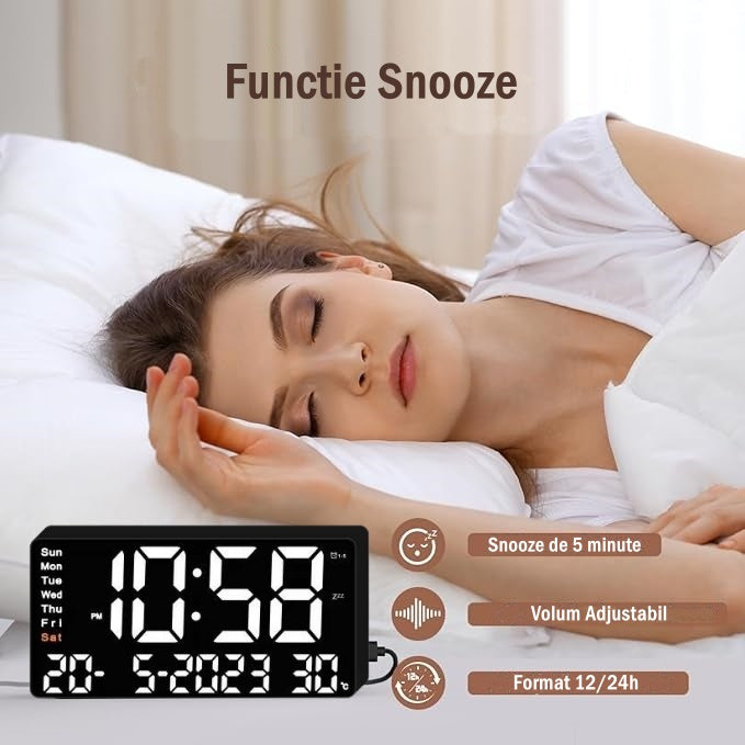 • Funcție Snooze – Oferă posibilitatea de a amâna alarma pentru un somn suplimentar.