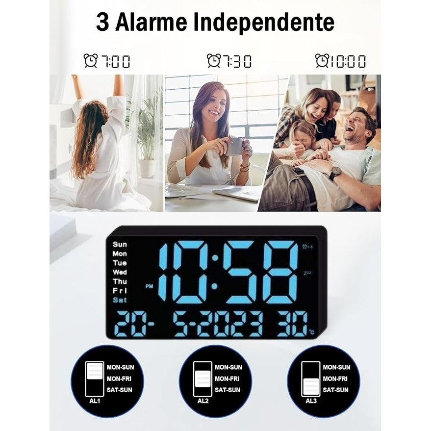 Ceas Digital de Masă cu LED Albastru – Afișaj 11x22cm cu Alarma, Calendar, Temperatura, Snooze și Mod de Noapte, 3 Niveluri de Luminozitate