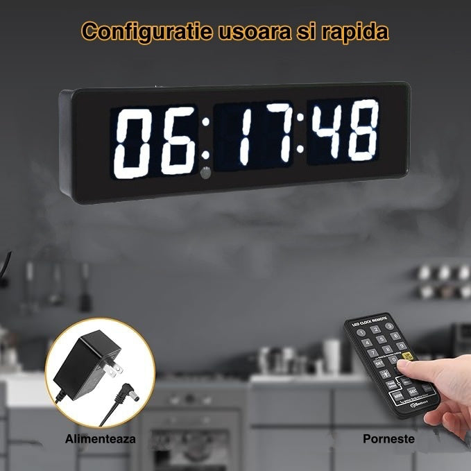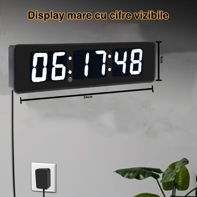 Ceas Digital de Masă și Perete 34x9cm cu LED Alb – Cronometru, Timer și Alarmă cu Luminozitate Ajustabilă