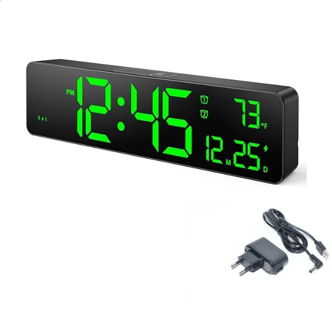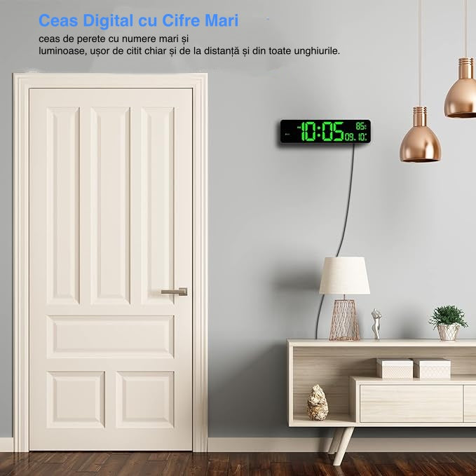 Ceas Digital de Masă și Perete 26x6cm cu Afișaj LED Verde – Cronometru, Timer, Alarmă, Funcție Snooze și Temperatură cu Luminozitate Ajustabilă