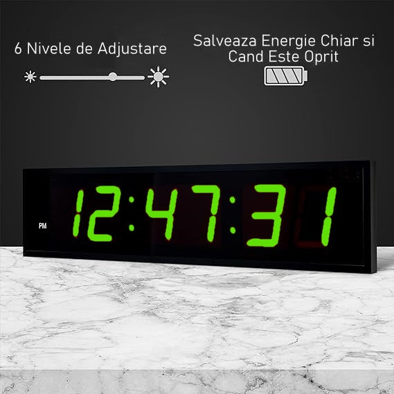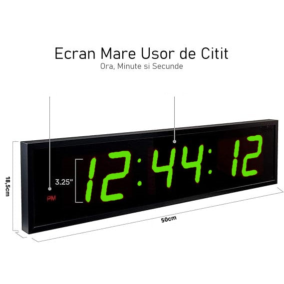 Descoperă Ceasul Digital LED de 50cm, perfect pentru a adăuga un aspect modern și funcțional oricărui spațiu. Cu un afișaj verde intens, acest ceas este ideal pentru săli de sport, birouri sau acasă. Controlat prin telecomandă, permite setarea ușoară a orei, alarmei, cronometrelor și temporizatoarelor. Eficient energetic, cu un design elegant, acest ceas se integrează perfect în orice decor.