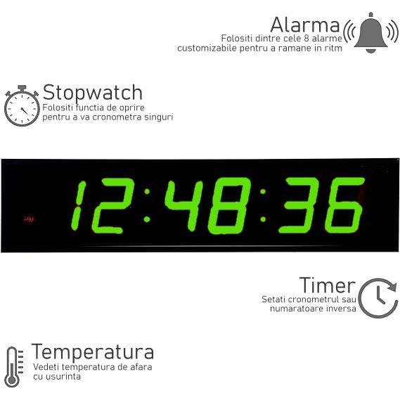 • Afișaj LED verde intens, vizibil de la distanță – ideal pentru săli de sport, birouri, studiouri sau acasă.