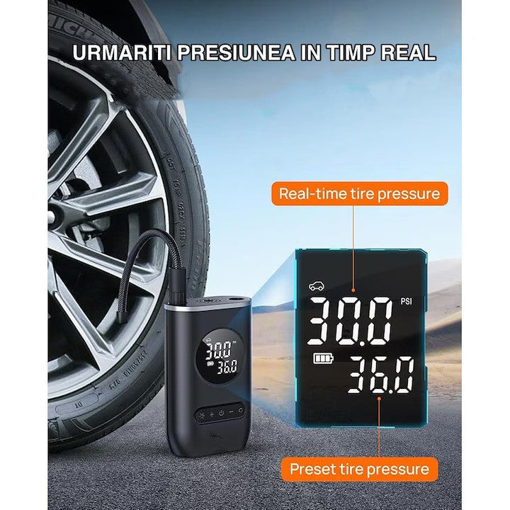 Compresor de Aer Portabil cu Afișaj Digital și Manometru – Pompa pentru Anvelope cu Lanternă LED, Încărcare USB Tip C, 5 Moduri Presetate pentru Bicicletă, Mașină, Motocicletă și Minge