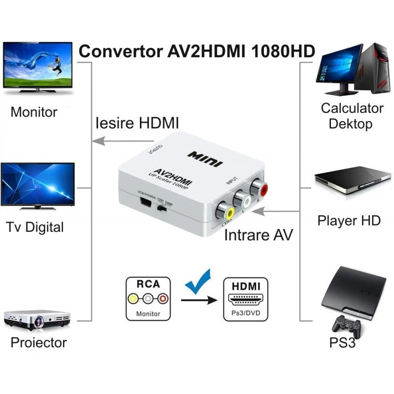 • Conectivitate avansată – Permite conectarea dispozitivelor cu ieșire AV (3RCA) la televizoare sau monitoare cu intrare HDMI.