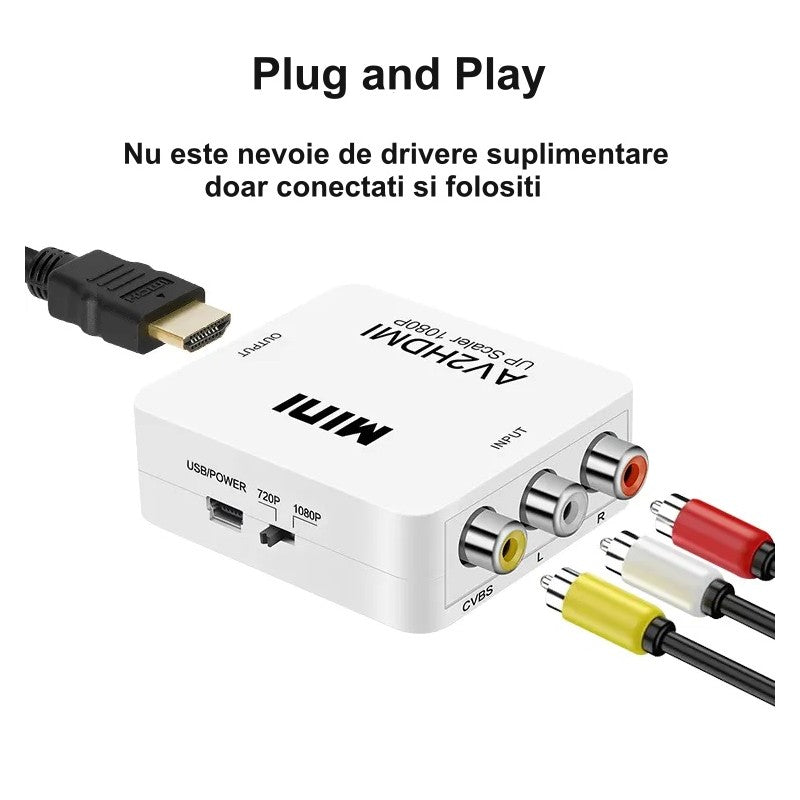 Convertorul Mini AV la HDMI HDV-554 este soluția ideală pentru a transforma semnalul video de la un cablu AV (3RCA) într-un semnal HDMI 1080P. Acest dispozitiv compact nu necesită drivere suplimentare și permite conectarea ușoară a dispozitivelor mai vechi, precum consolele de jocuri sau computerele, la televizoare și monitoare moderne, oferind o calitate superioară a imaginii.