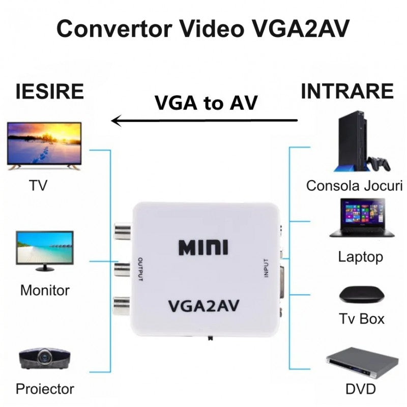 Convertor Mini VGA la AV cu 3 RCA - VGA-3RCA HDV-555 pentru Conexiuni Video la Televizoare și Proiectoare
