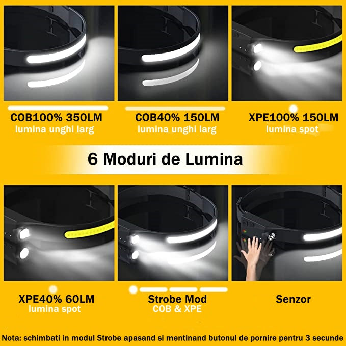 Lanternă de Cap LED Profesională cu Acumulator Inclus – Flexibilă, Rezistentă la Apă, Senzor de Mișcare și 4 Moduri de Lumină