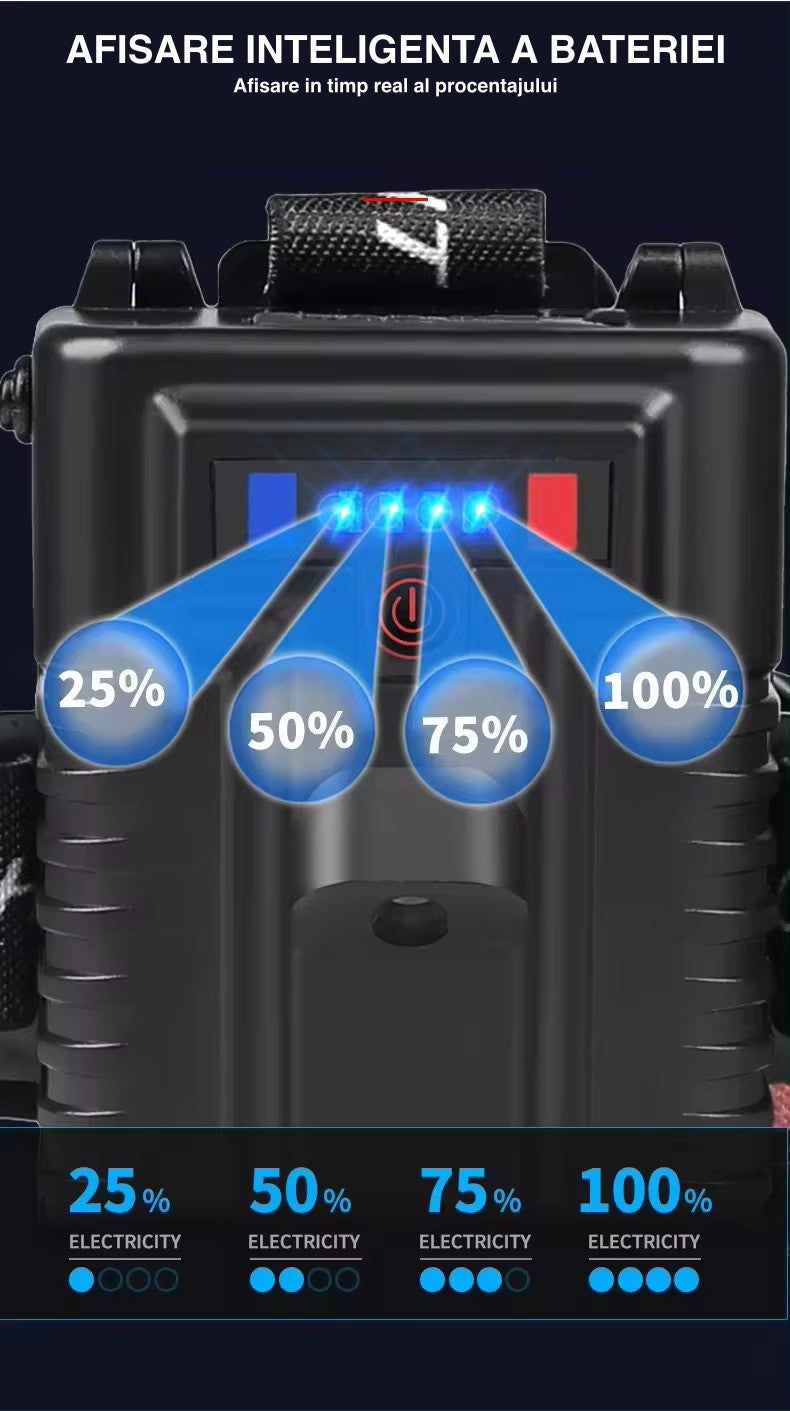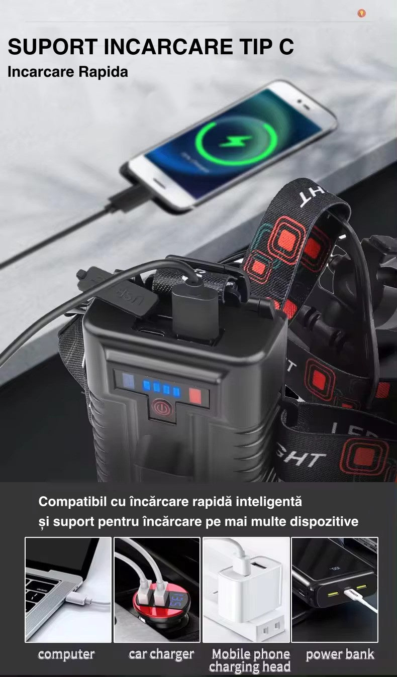 Lanterna de Cap Profesională VTM® cu LED – Proiecție SOS, Încărcare Rapidă Tip C, 3 Moduri de Lumină, Acumulatori Incluși, Afișaj Procentaj Baterie pentru Pescuit, Camping, Vânătoare, Culoare Neagră