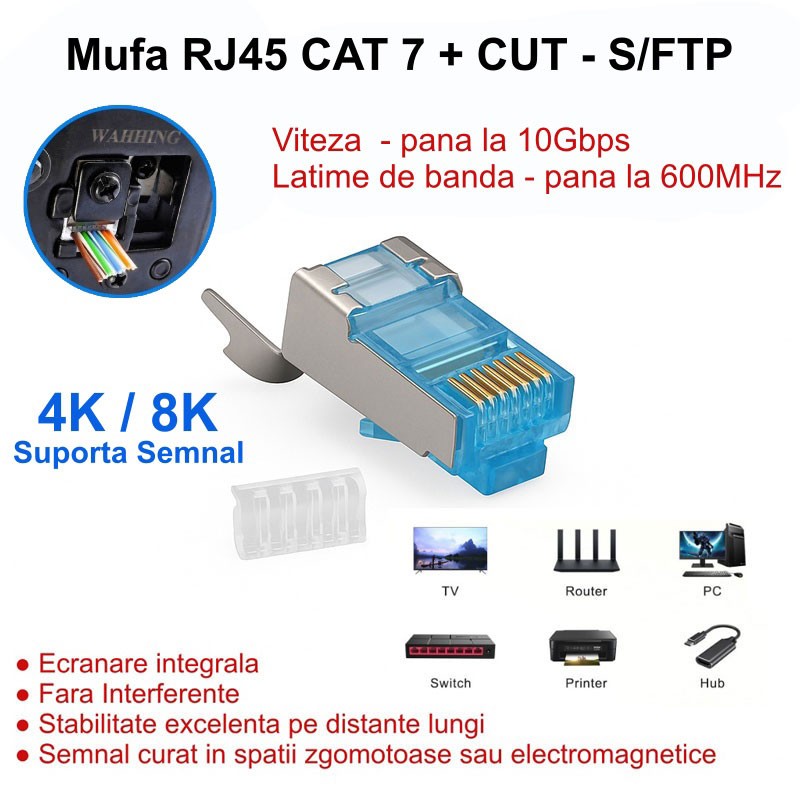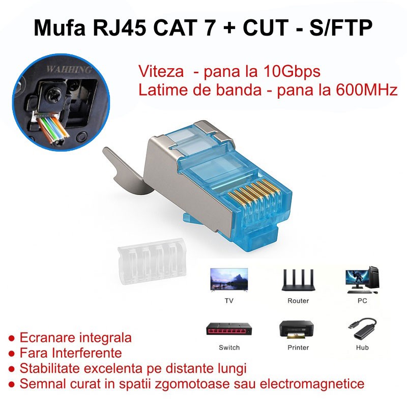 Într-o lume în care conectivitatea rapidă și fiabilă este esențială, mufa RJ45 S/FTP CAT 7 CUT Albastru cu Ecranare Metalică se dovedește a fi un instrument indispensabil pentru profesioniștii din domeniul rețelisticii. Acest set de 50 de mufe nu doar că îndeplinește cele mai înalte standarde de performanță, dar facilitează și o instalare eficientă, adaptându-se nevoilor exigente ale rețelelor moderne.