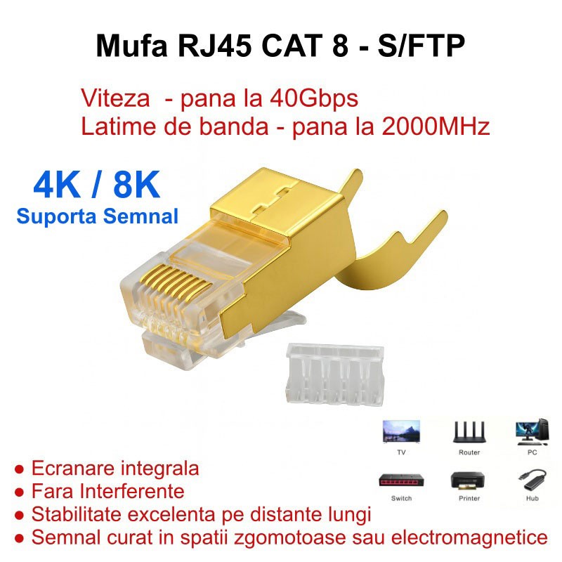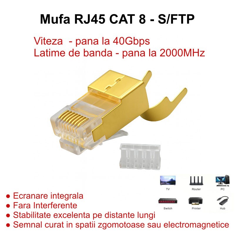 Îmbunătățiți performanța rețelei dumneavoastră cu setul premium de mufe RJ45 S/FTP CAT 8, esențiale pentru infrastructuri de rețea de vârf. Aceste mufe sunt concepute pentru a răspunde celor mai exigente cerințe ale tehnologiei moderne, asigurând o conectivitate rapidă și fiabilă, indispensabilă în mediile de afaceri și în centrele de date.