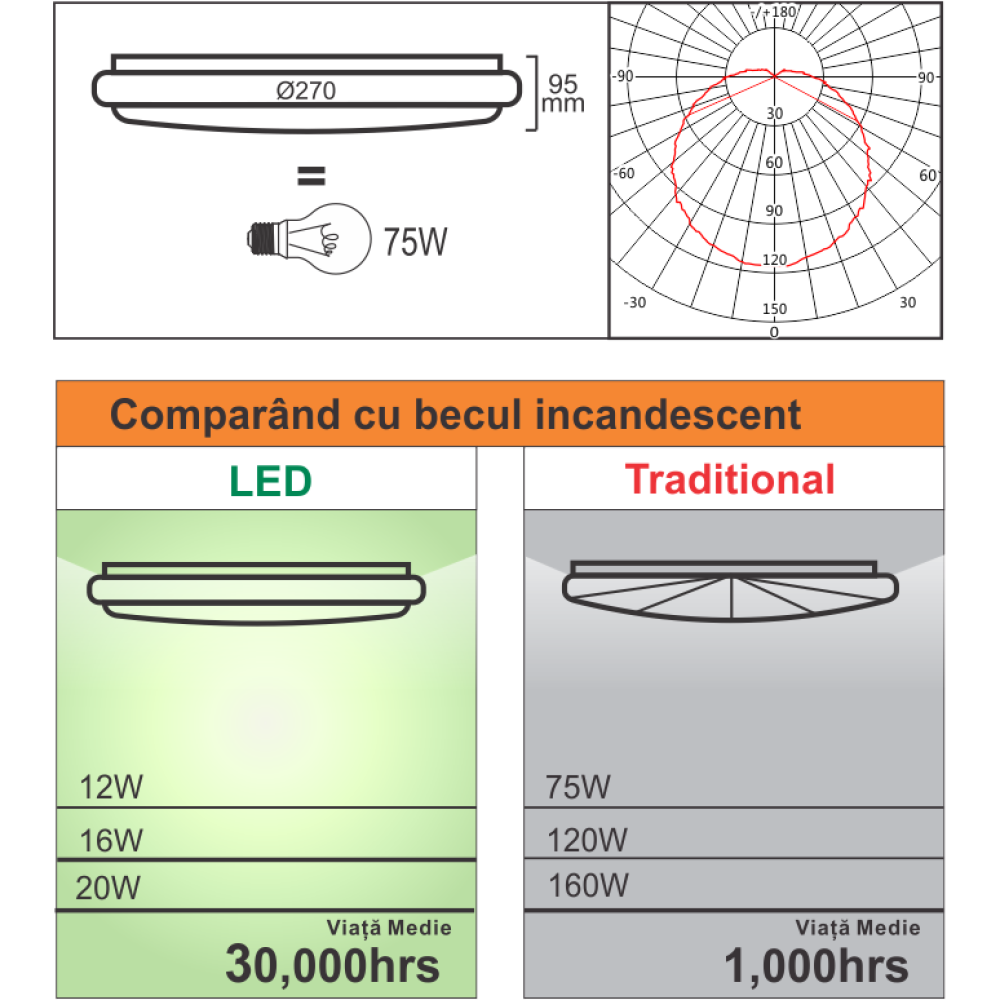 • Eficiență energetică – Consum redus de 12W, echivalent cu un bec de 75W.