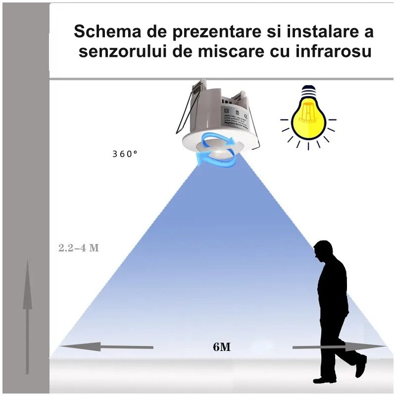 Senzor de Mișcare 360° cu Infraroșu Incastrabil – Detectare Automată pentru Iluminat Interior și Exterior