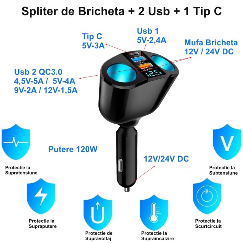 Descoperă Splitterul Brichetă Auto, un accesoriu esențial pentru orice călătorie. Acest dispozitiv permite alimentarea și încărcarea rapidă a mai multor dispozitive simultan, datorită celor două prize pentru bricheta auto și celor trei conectori USB. Echipat cu protecții avansate, acest splitter asigură siguranța tuturor gadgeturilor tale în timpul călătoriilor. Ideal pentru camioane, SUV-uri și autoturisme, acest produs îmbunătățește experiența de călătorie.