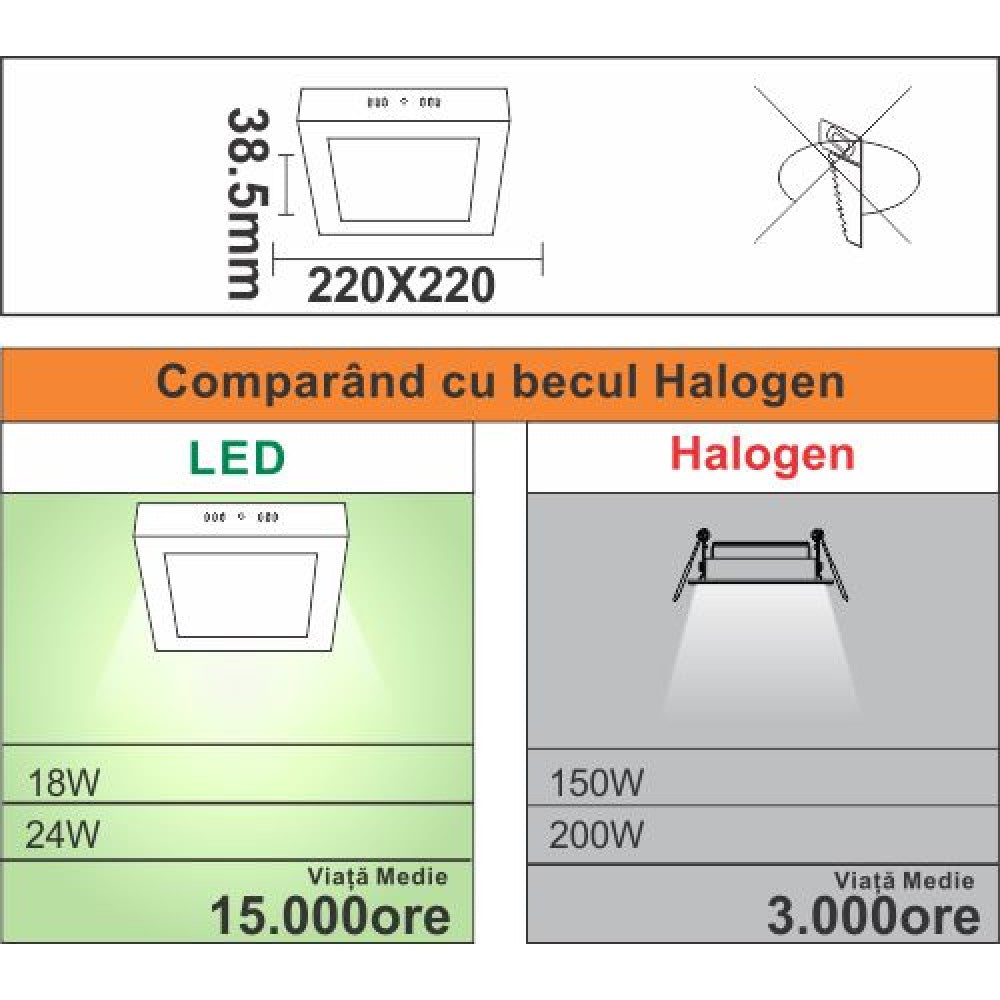 Spot LED Patrat 220x220x37mm, 18W Echivalent 150W, Lumina Rece 6400K pentru Iluminat Interior și Exterior