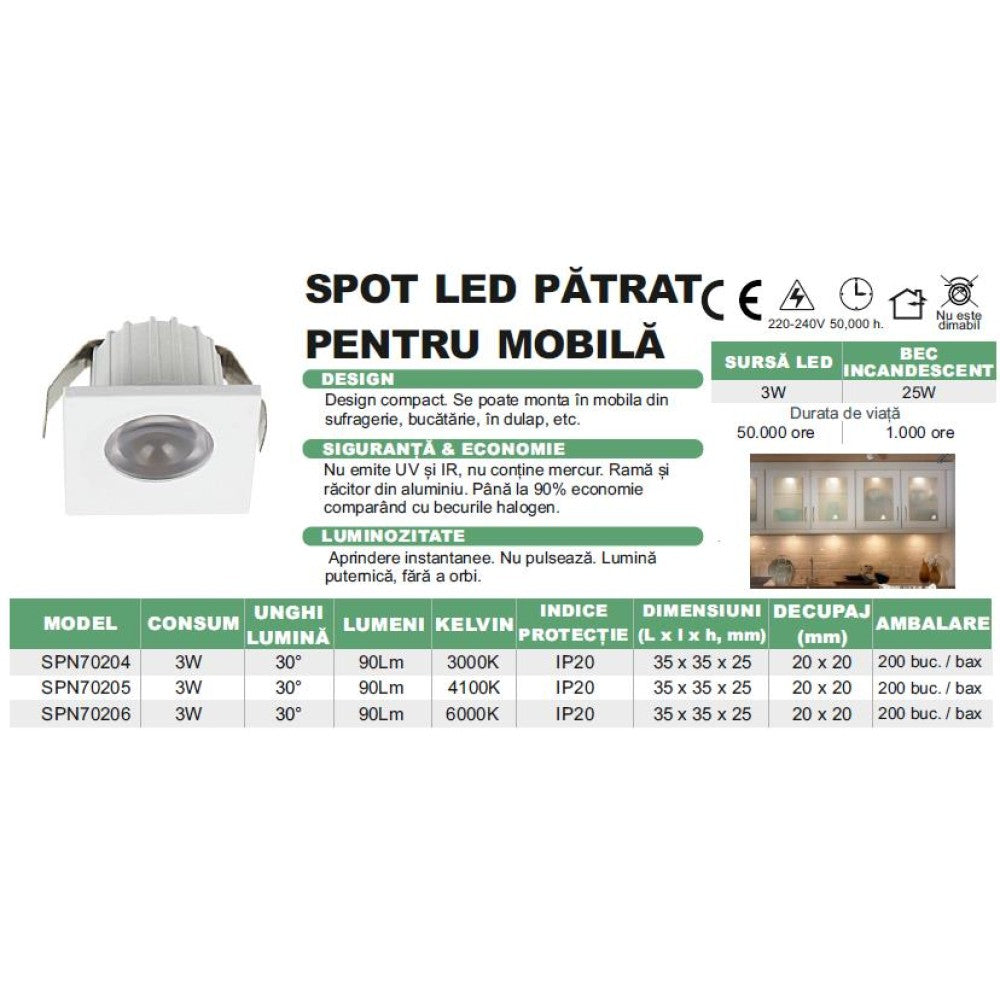Spot LED Pătrat 35x35mm, 3W 4100K – Iluminat Modern pentru Mobilă