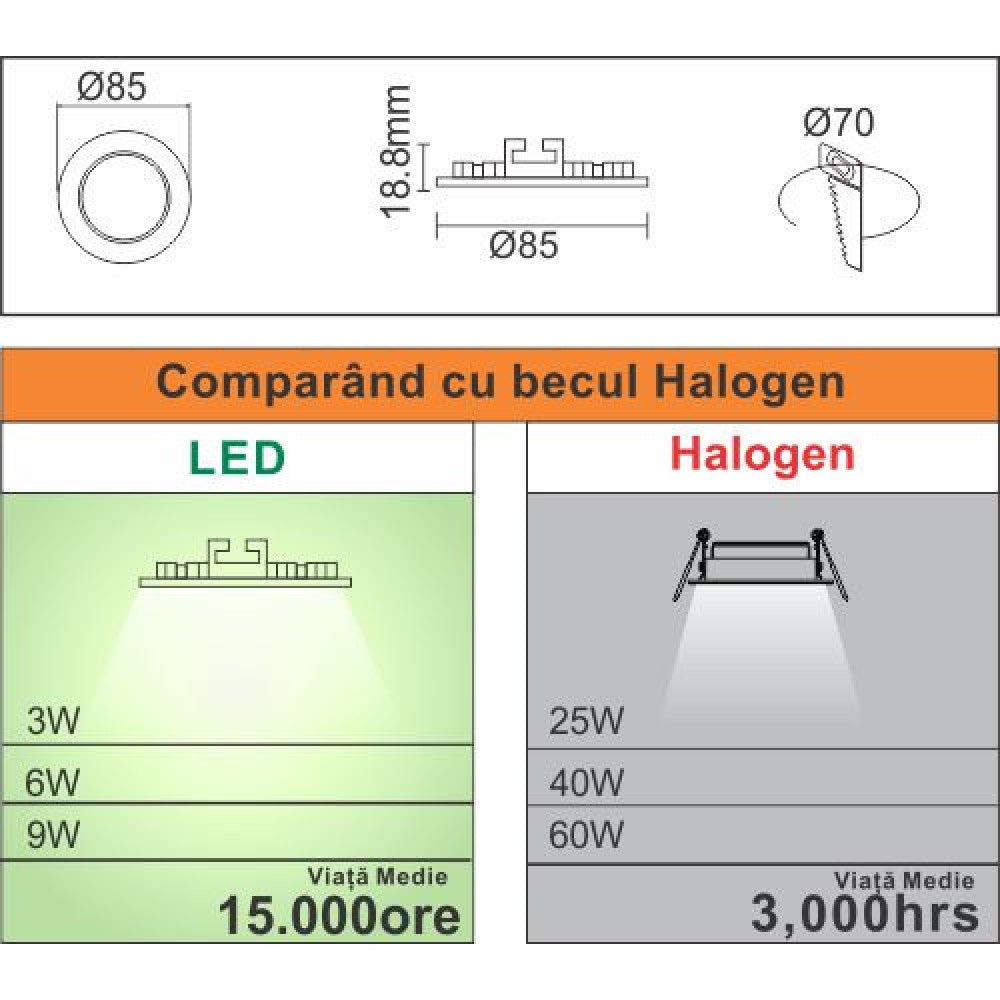 Acest lucru înseamnă că spotul de 3W oferă un flux luminos similar cu cel al unui bec tradițional de 25W.