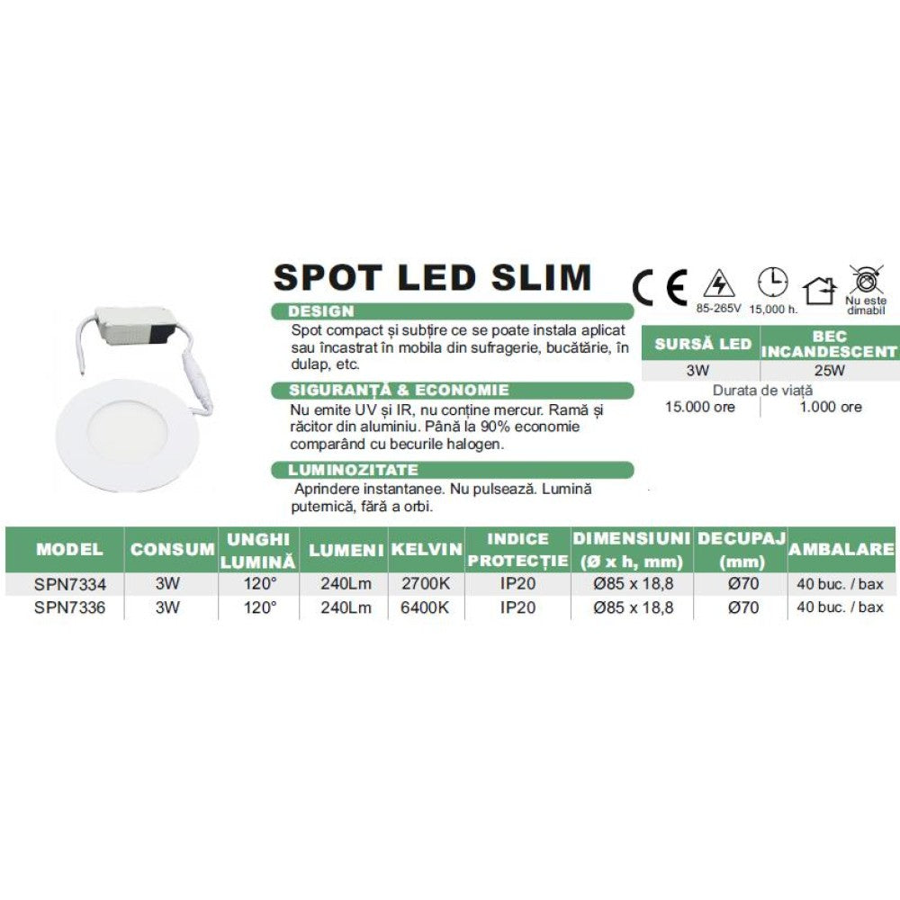 Spot LED Slim Ø85mm 3W (Echivalent 25W) – Iluminat Eficient cu Lumină Rece 6400K pentru Spații Interioare