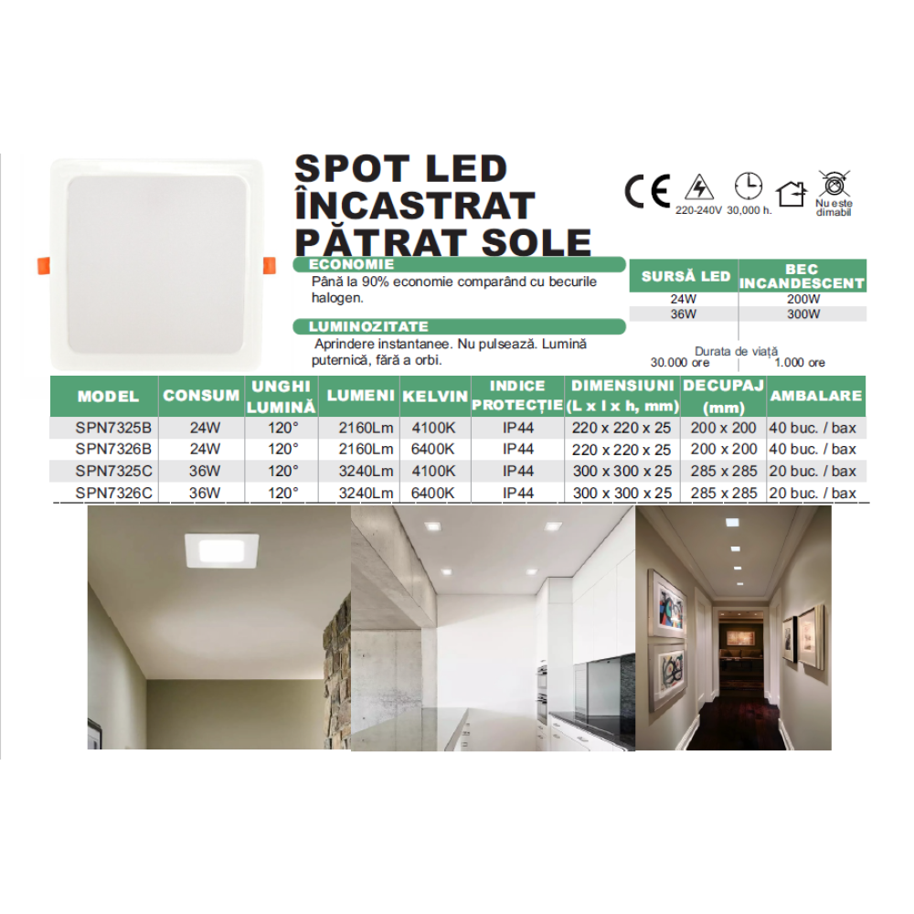 Spotul LED îngropat patrat de 220x220mm, cu un consum de 24W, oferă o iluminare eficientă și de lungă durată, ideală pentru orice spațiu interior care necesită lumină rece. Datorită designului său discret, se integrează perfect în orice decor, asigurând o iluminare uniformă și plăcută.